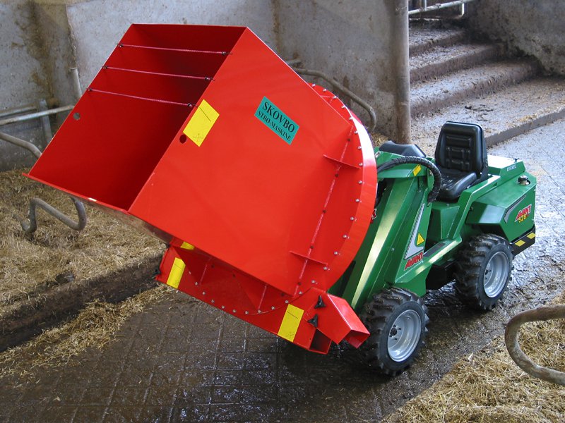 Skovbo stroblazer met een uitwerp aan de linkerzijde het geheel gemonteerd aan een Avant mini shovel.